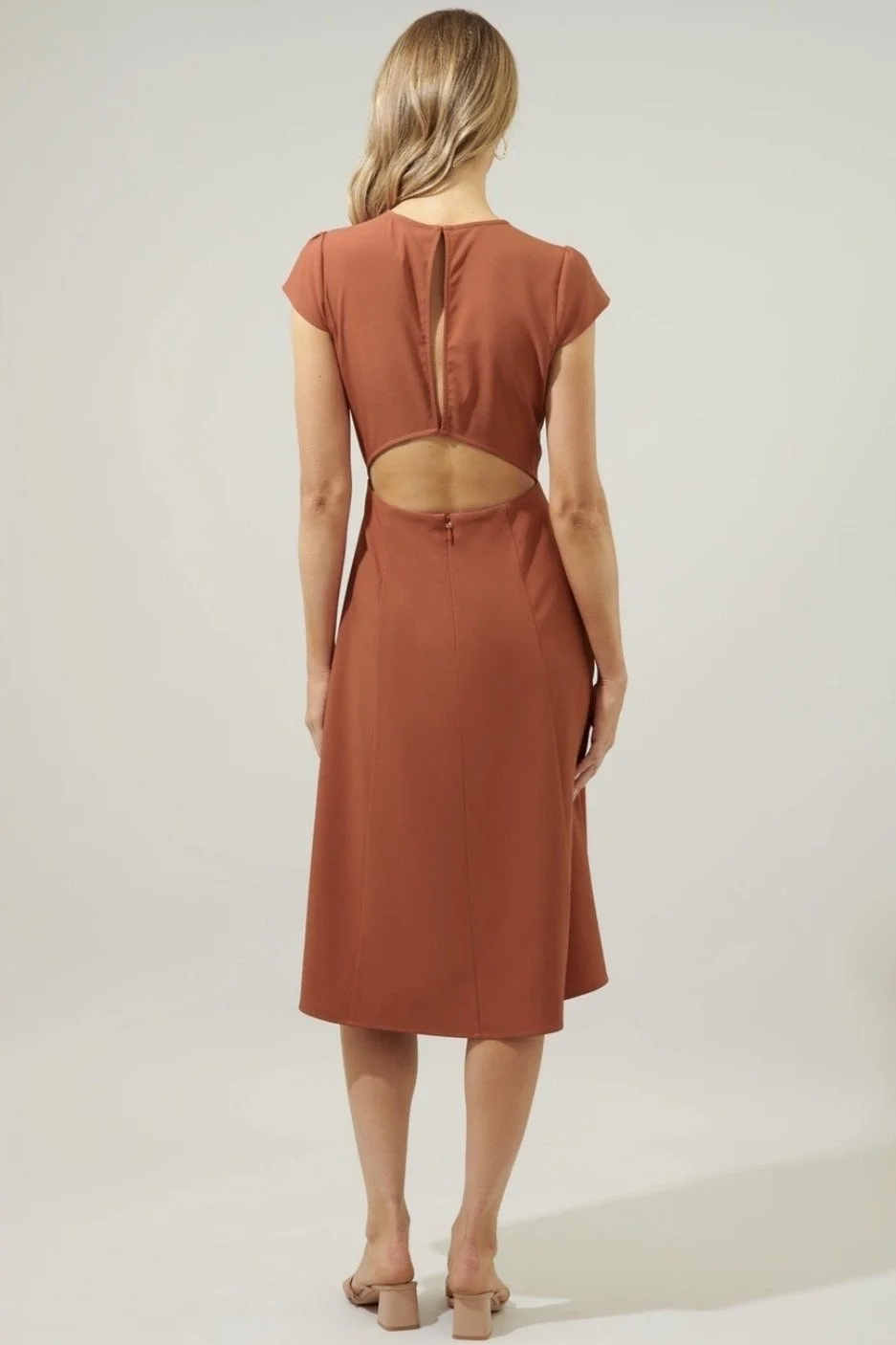 Image 1 of 2 Image 2 of 2 Dalia Cutout Midi Dress Sale Price: $25.00 Original Price: $50.00 Rust Brown w Split detail Size: Select Size XSmall Small Medium Large XLarge Color: Select Color Rust - Brown Add To Cart Added! Rust Brown w Split detail Reviews Reviewer Name Review Date Star Rating Description Posted on Etsy Product Show More